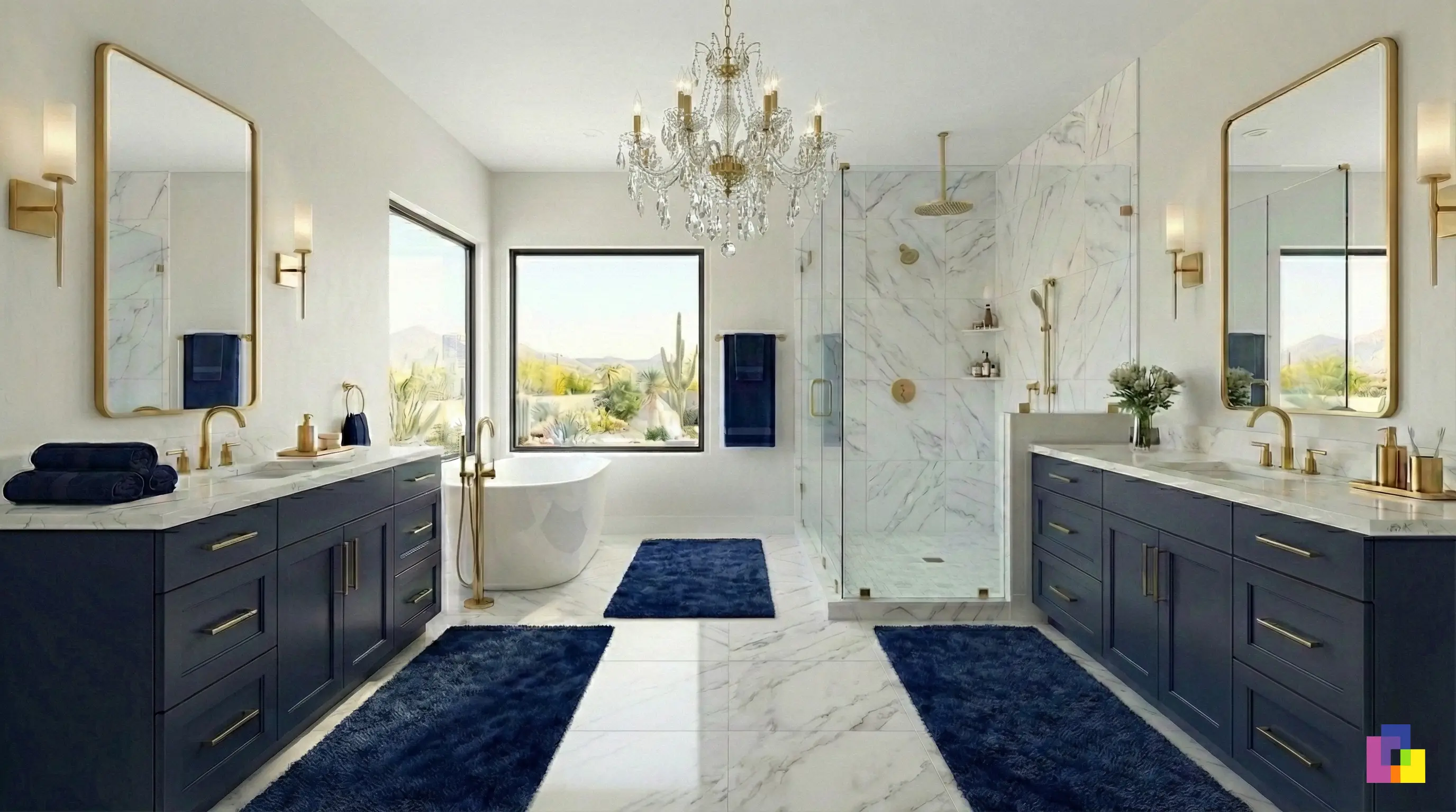 Living in this Paradise Valley home now feels like a daily transition between high-energy sophistication and deep, restorative comfort. In the common areas, the client feels a constant sense of pride and "arrival"; the bold Navy and Gold palette creates a backdrop that is immediately impressive and ready for Architectural Digest. The crisp white millwork against the dark blue walls makes the space feel custom and deliberate, while the tiered crystal chandelier in the entrance adds just enough sparkle to make coming home feel like a special occasion. It is a space that energizes them, perfectly suited for hosting guests or simply enjoying a polished, tailored environment that feels far removed from the "builder beige" they started with.