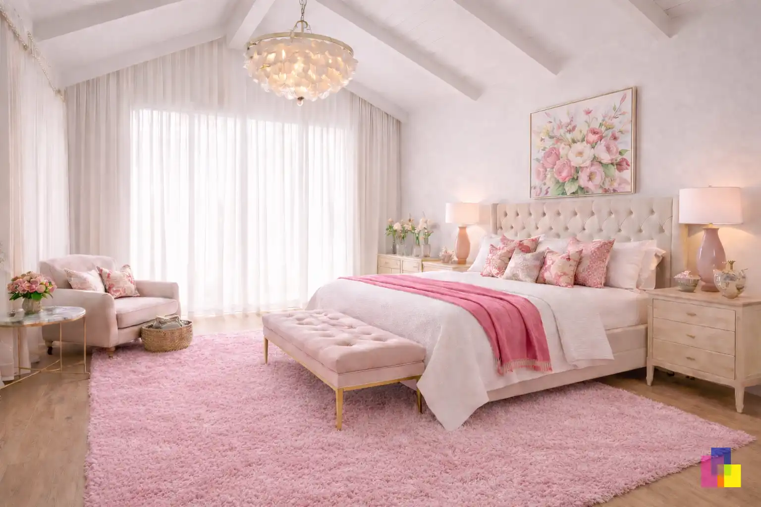 She envisioned soft pinks, brass details, rounded forms, and cheerful tones layered over a clean, timeless architectural foundation. From the tailored kitchen with golden accents to the vaulted living room and dreamy, blush-toned bedroom, each space was curated with a fresh take on mid-century modern living. The look was never retro — it was a refined, optimistic interpretation of a style she’d loved for years.