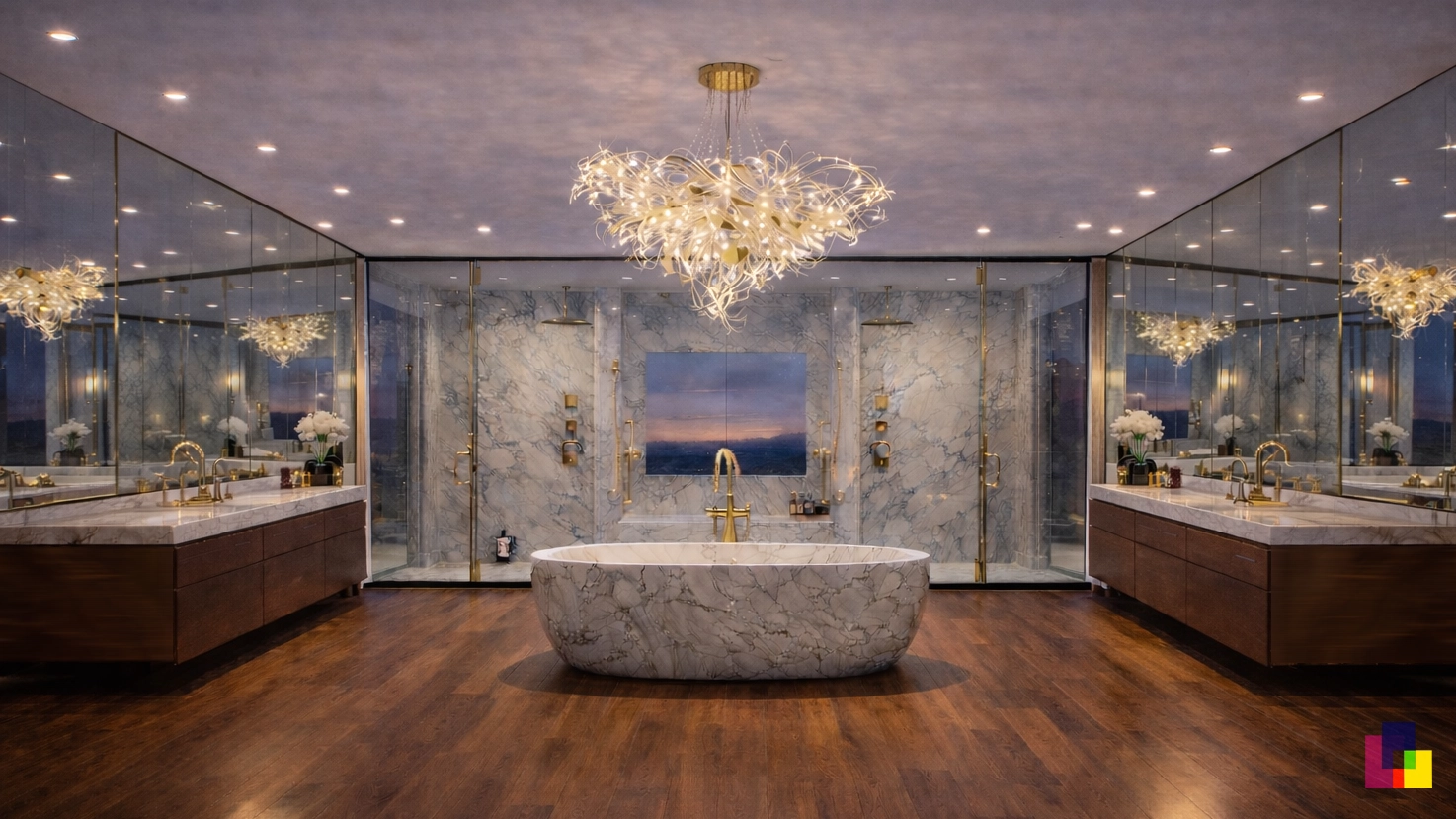 Material selection would be key. We would use premium finishes such as rich woods, polished metals, stone surfaces, and high-quality glass to reinforce the upscale aesthetic.
